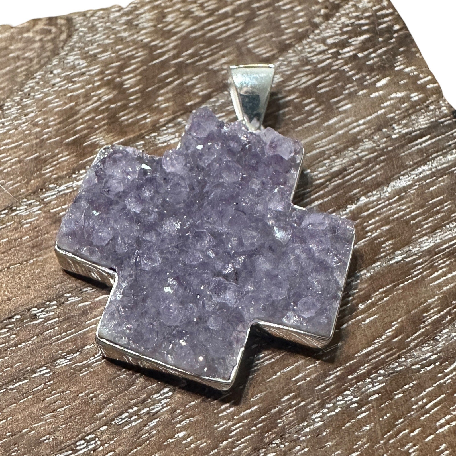 Stunning natural Amethyst Druzy Cross pendant set in solid .925 sterling silver. This beautiful piece features sparkling lavender-purple crystal clusters with excellent natural texture and depth. The handcrafted silver bezel frames the druzy perfectly, creating a bold and eye-catching statement pendant. Measures approximately 1⅝ inches and weighs 12 grams. A gorgeous addition for crystal lovers, gemstone collectors, or anyone who loves unique artisan-made jewelry.