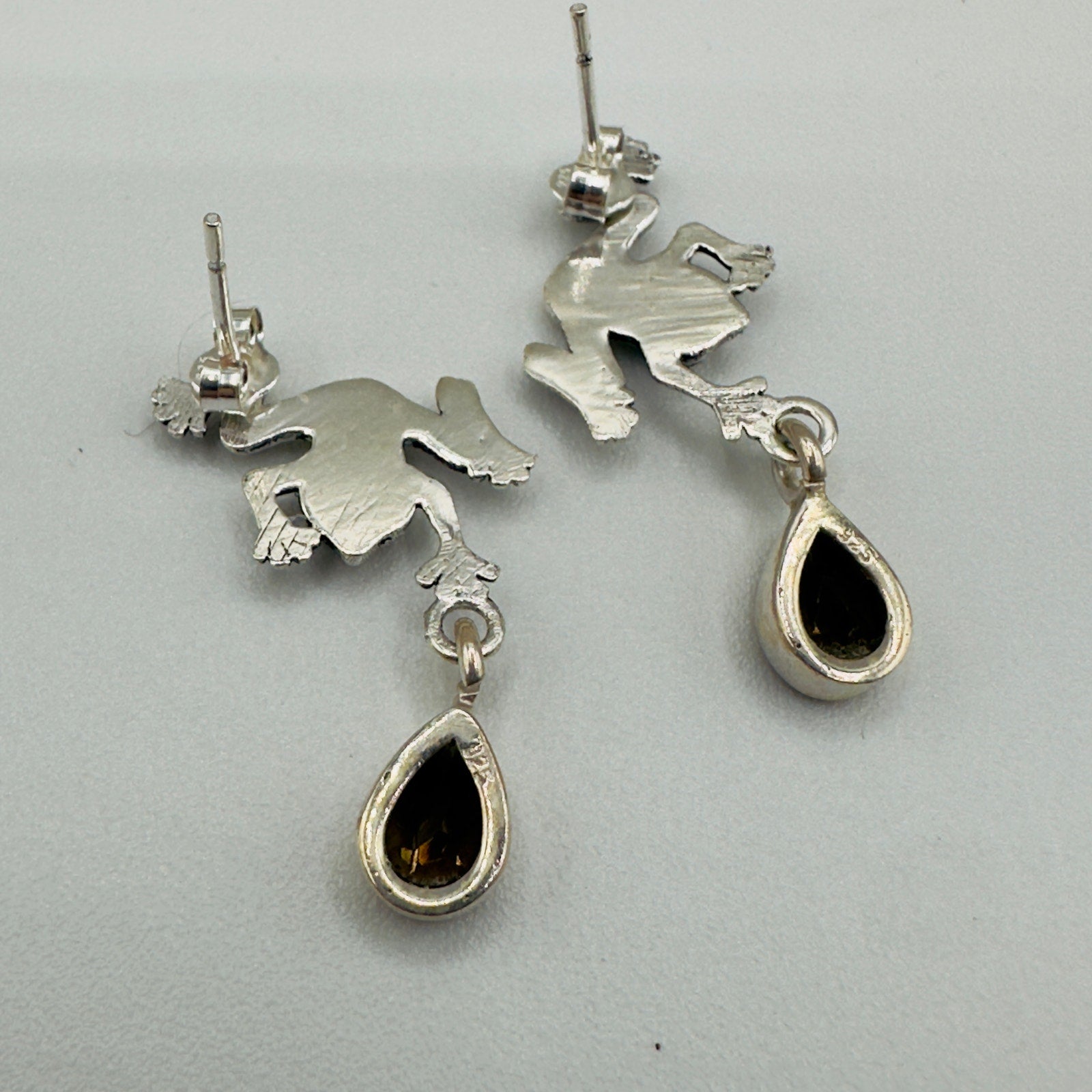 925 sterling silver frog earrings featuring detailed frog motifs with dangling smoky topaz teardrop stones. Polished silver finish with articulated movement that catches the light beautifully. A whimsical yet elegant design inspired by nature, perfect as a statement accessory or unique gift.