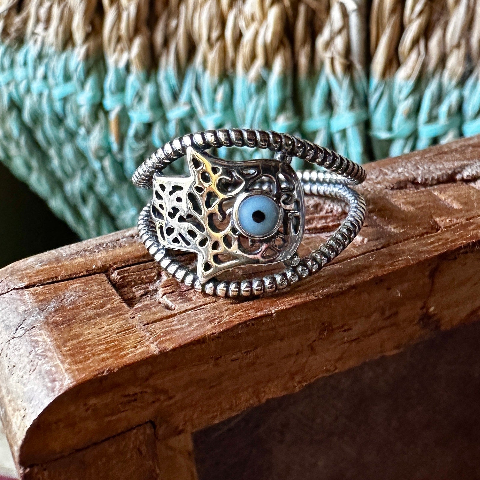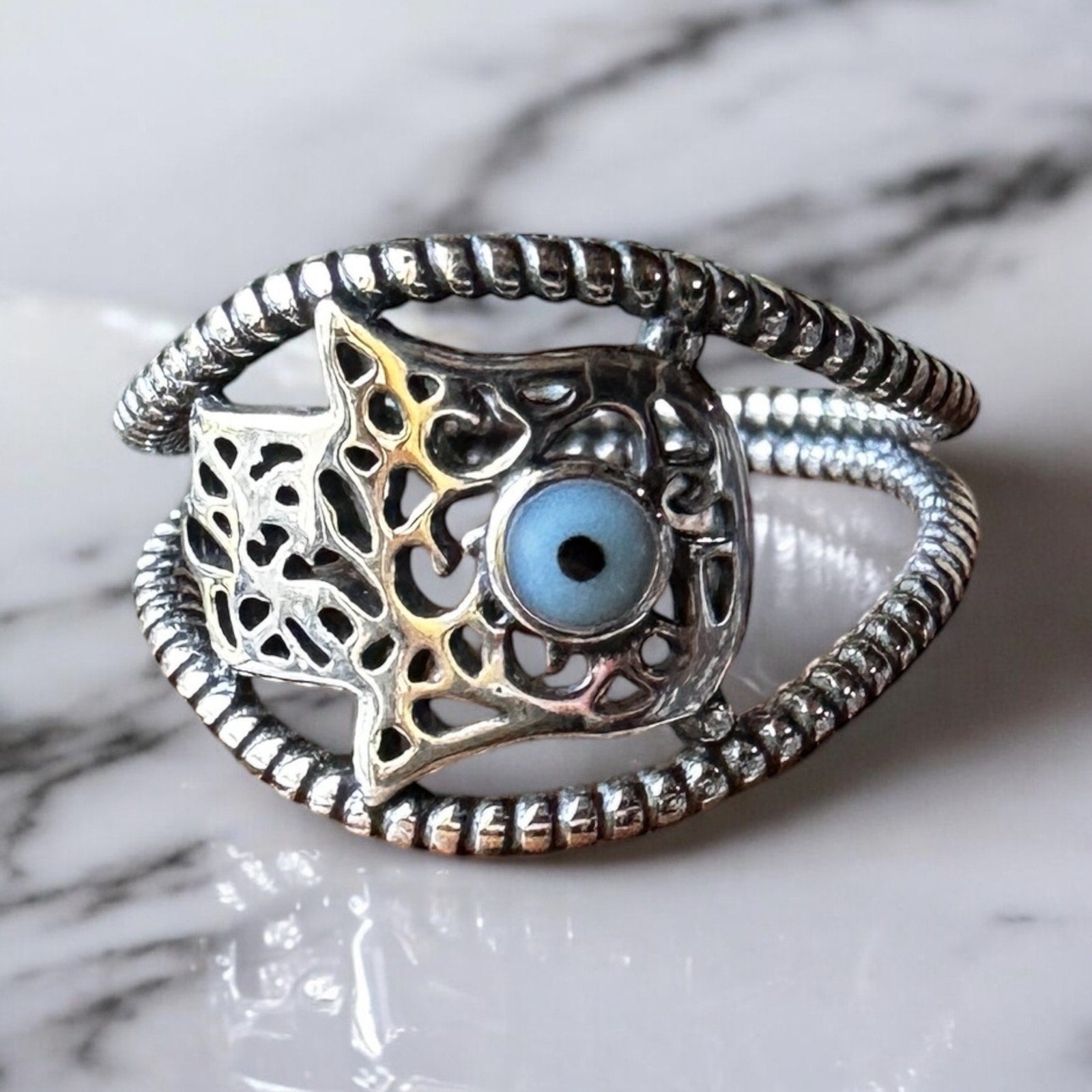 Embrace protection and style with this exquisite Hamsa sterling silver ring. Crafted from high-quality 925 sterling silver, the intricately designed Hamsa hand symbolizes good fortune, health, and protection against negative energies. The polished finish enhances its elegant appeal, making it a perfect statement piece for everyday wear or special occasions. Ideal as a meaningful gift or a personal talisman, this timeless ring complements any jewelry collection.