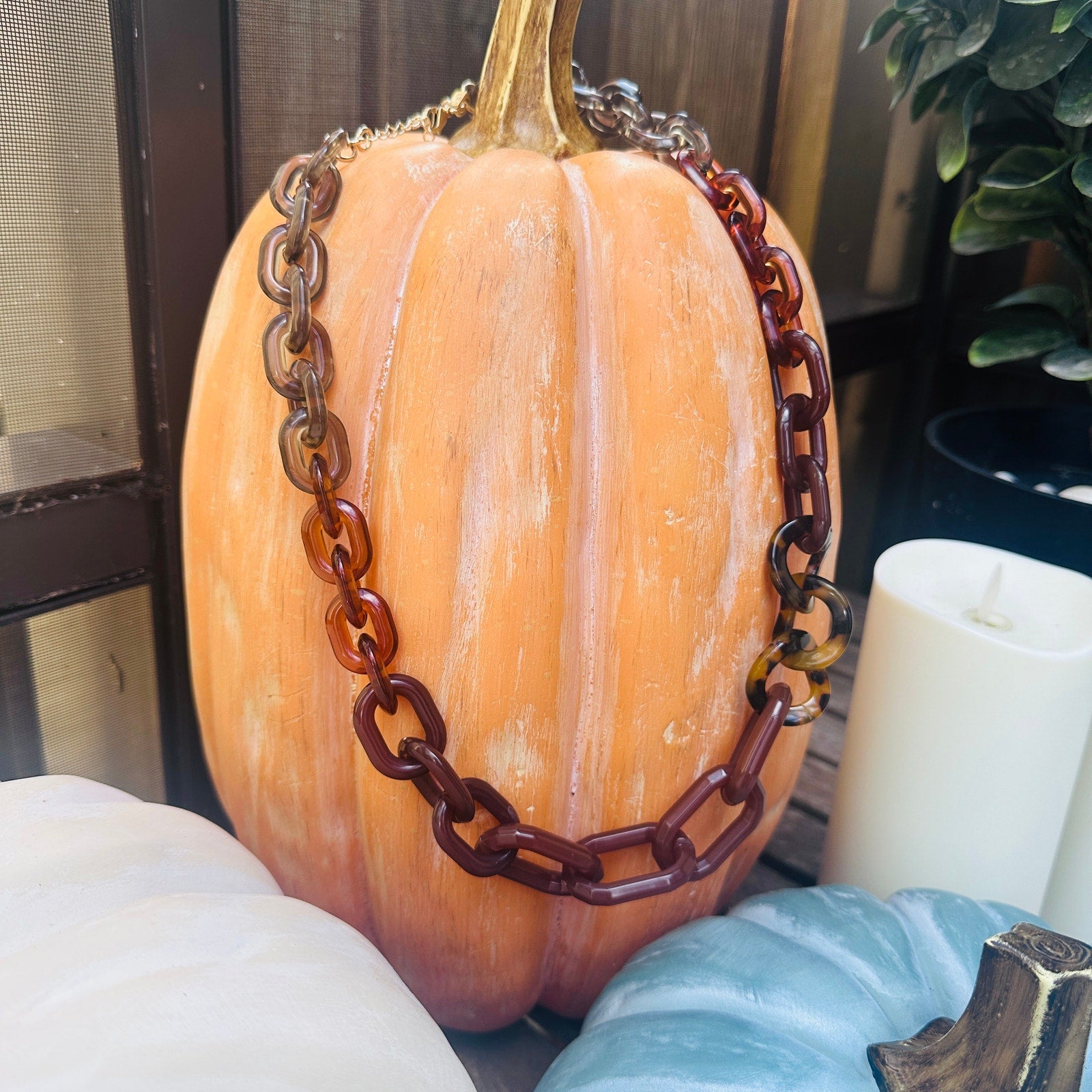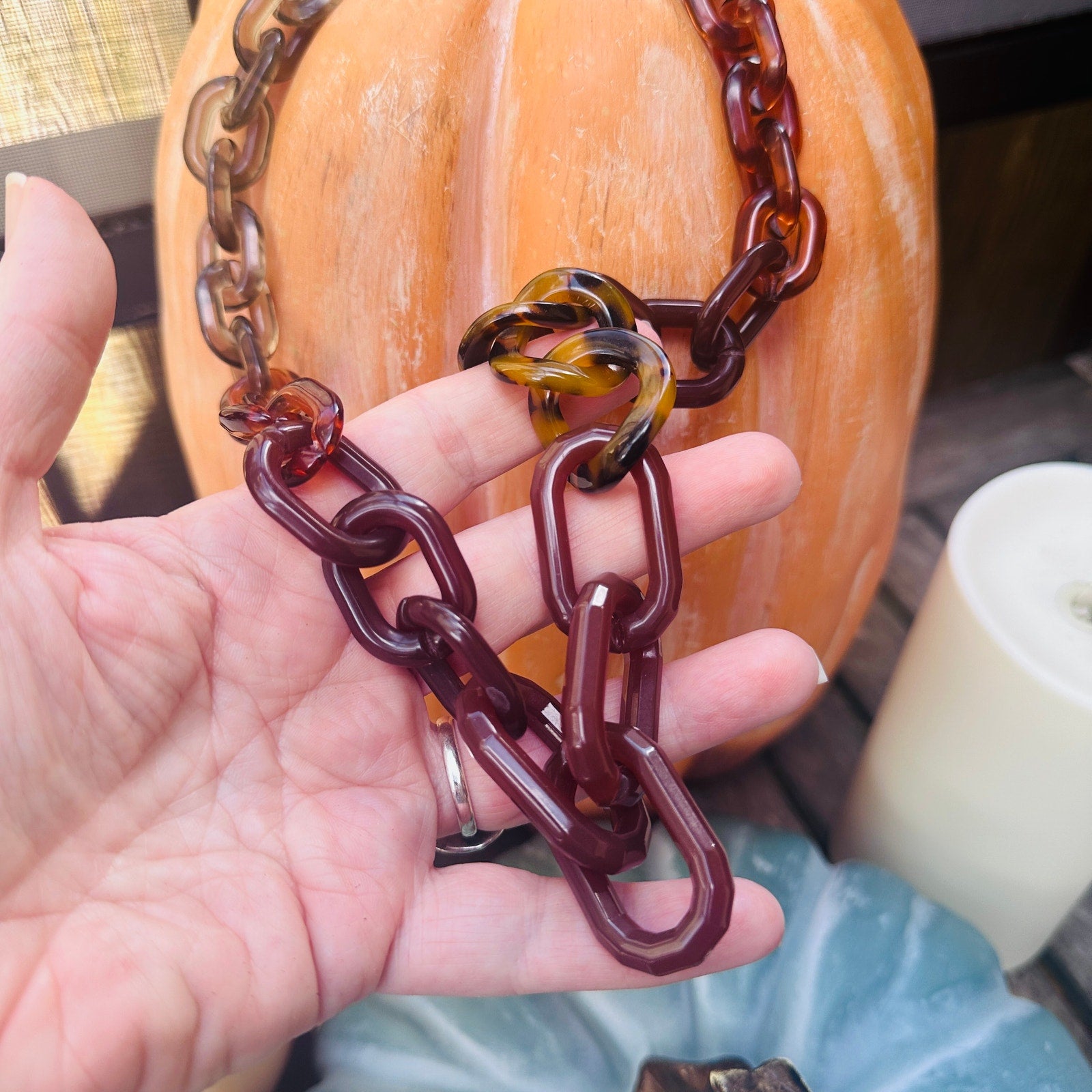 Stunning Banana Republic statement necklace featuring oversized acrylic links in shades of plum, amber, tortoise, and smoky gray. The lightweight design makes it comfortable for all-day wear while adding bold color and texture to any outfit.