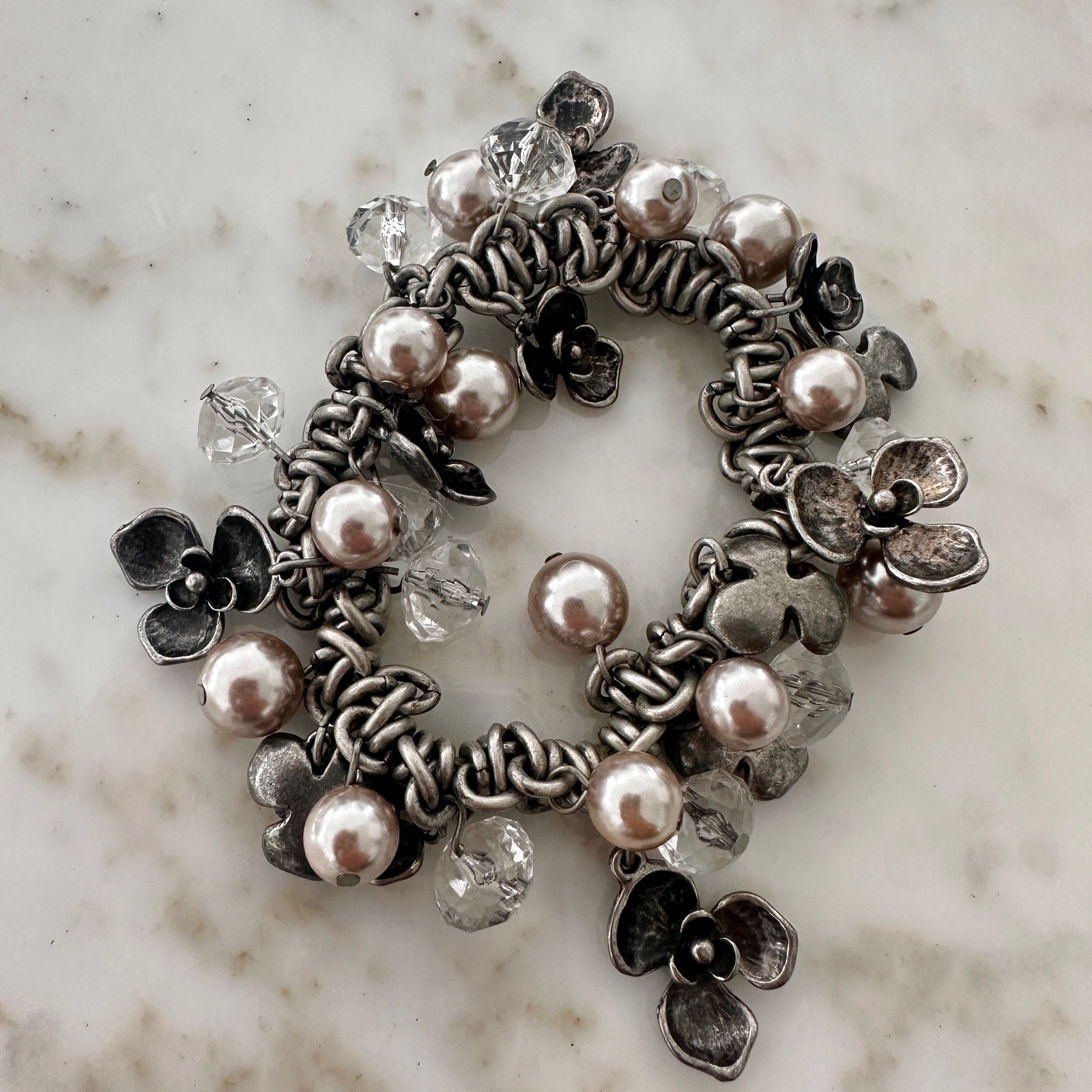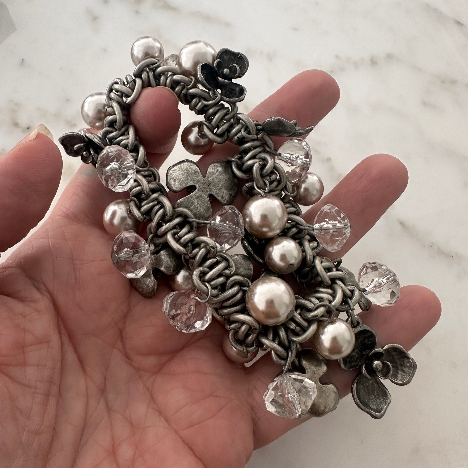 This stunning Chico’s charm bracelet brings a bold yet feminine touch to your look. Designed with a mix of silvertone metal links, hammered clover charms, faux pearls, and clear faceted beads, it delivers eye-catching texture and movement. Stretch design for easy wear.