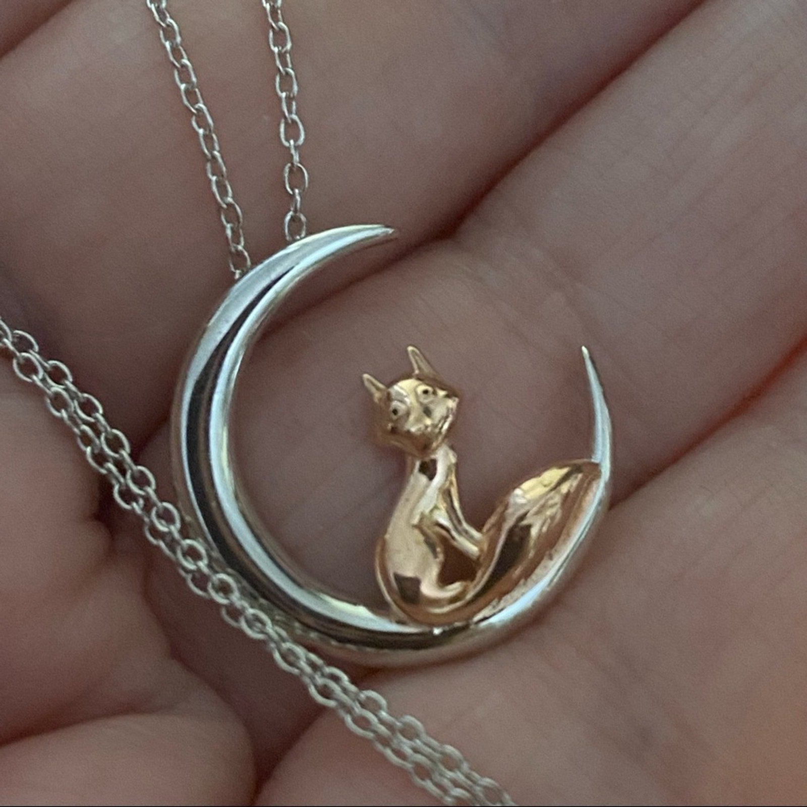Fox and Crescent Moon Sterling Silver and Rose Gold Necklace