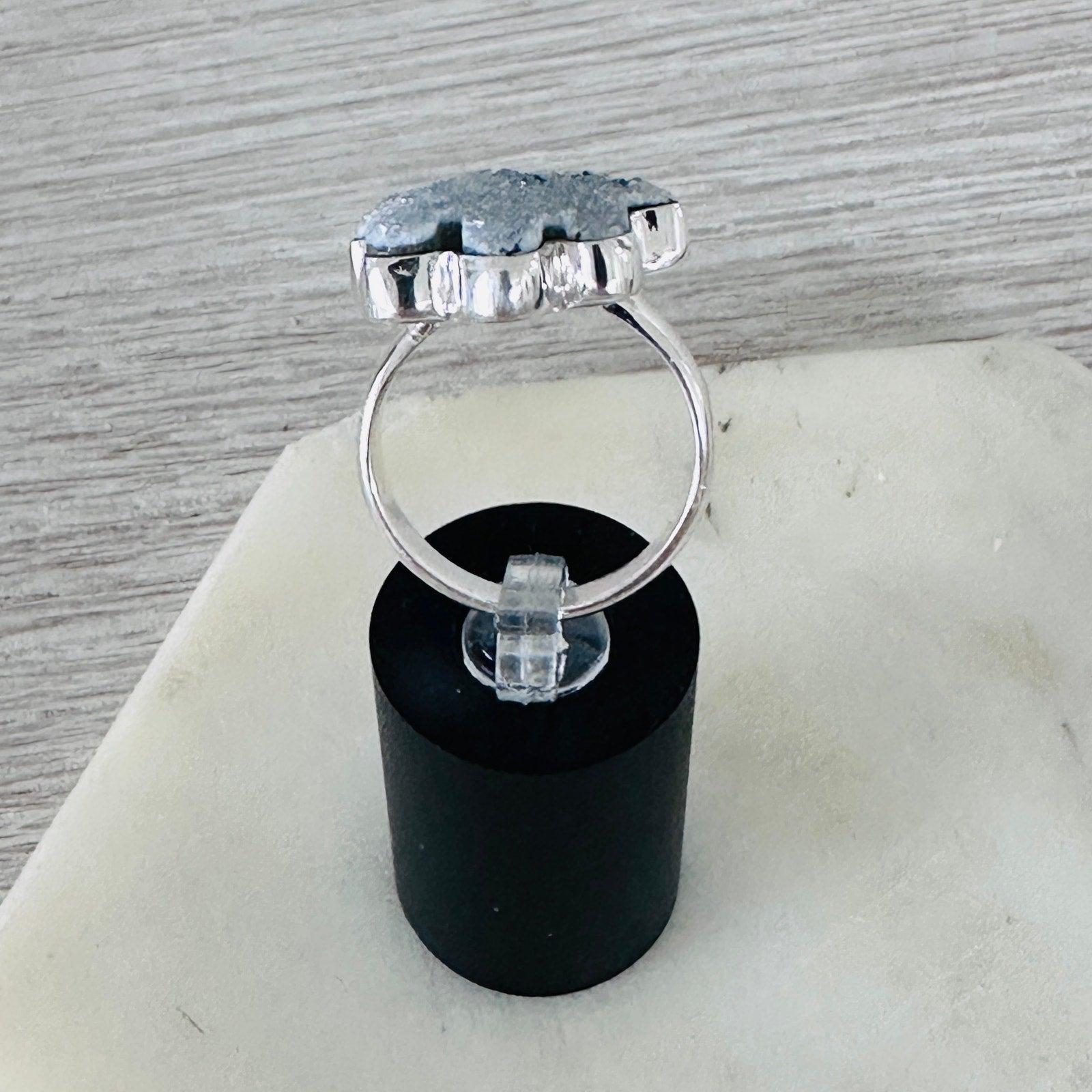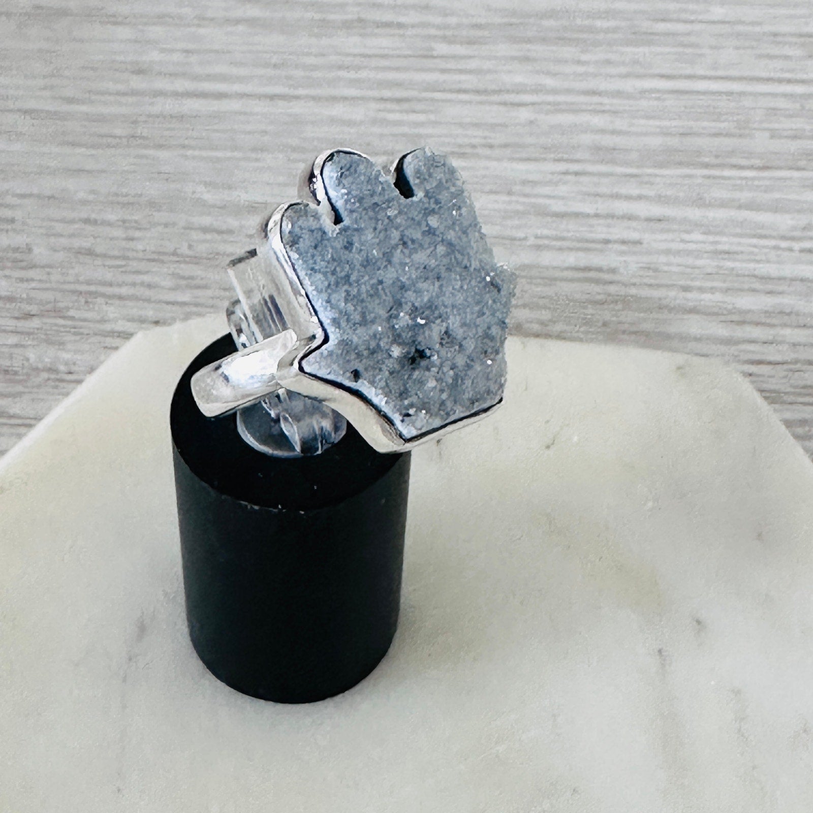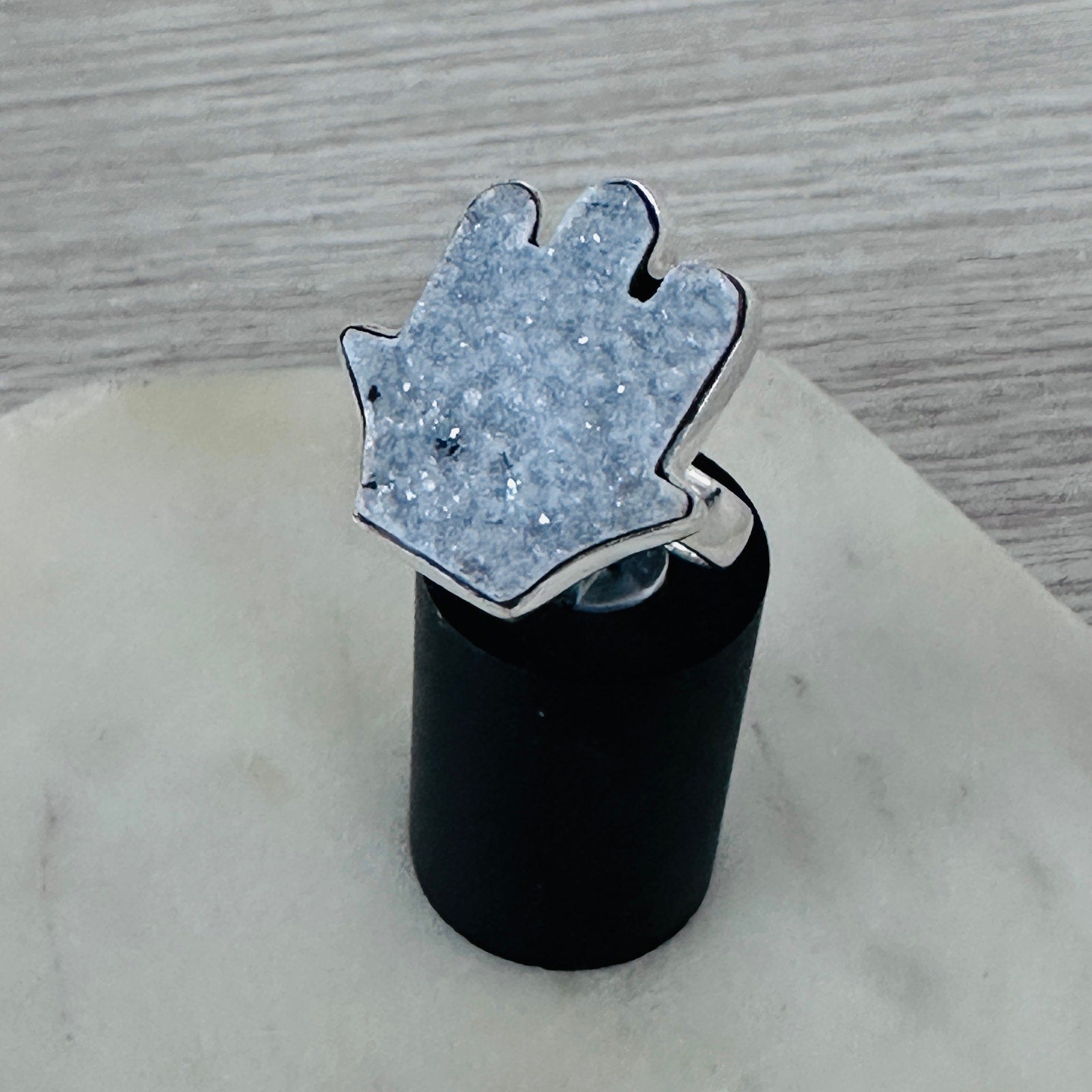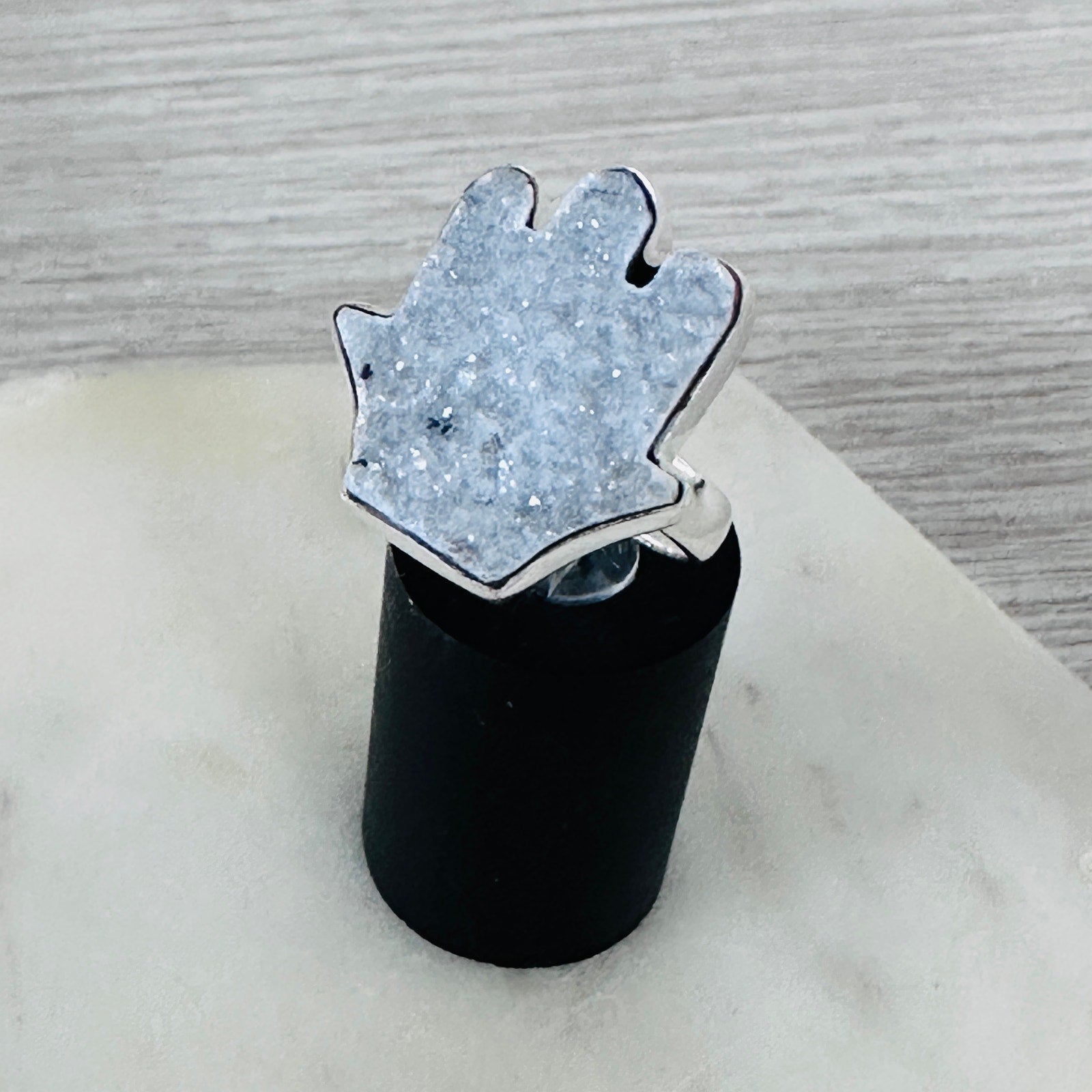 Hamsa Agate Druzy Sterling Silver Ring – Size 8, 925 Natural Stone