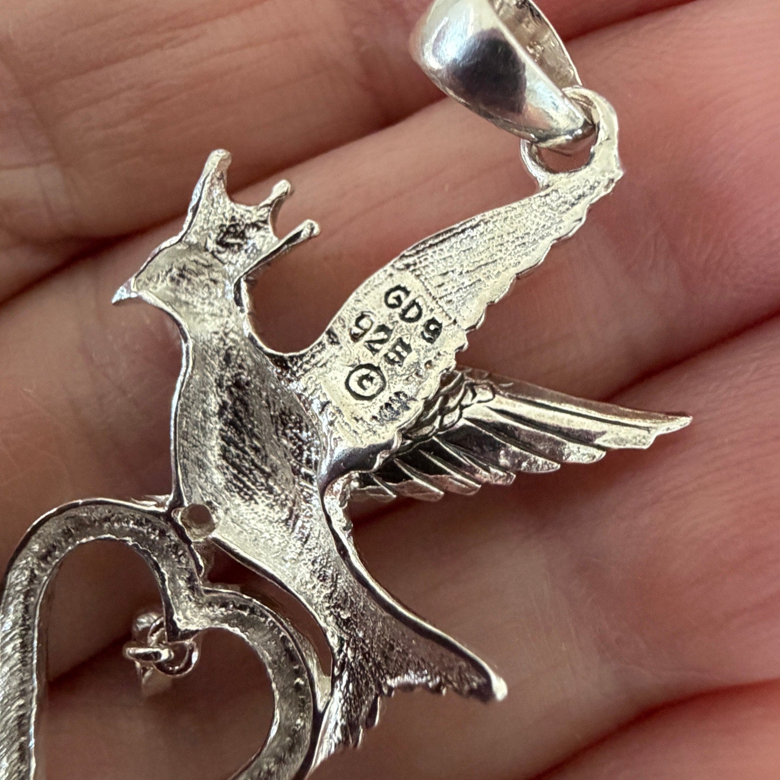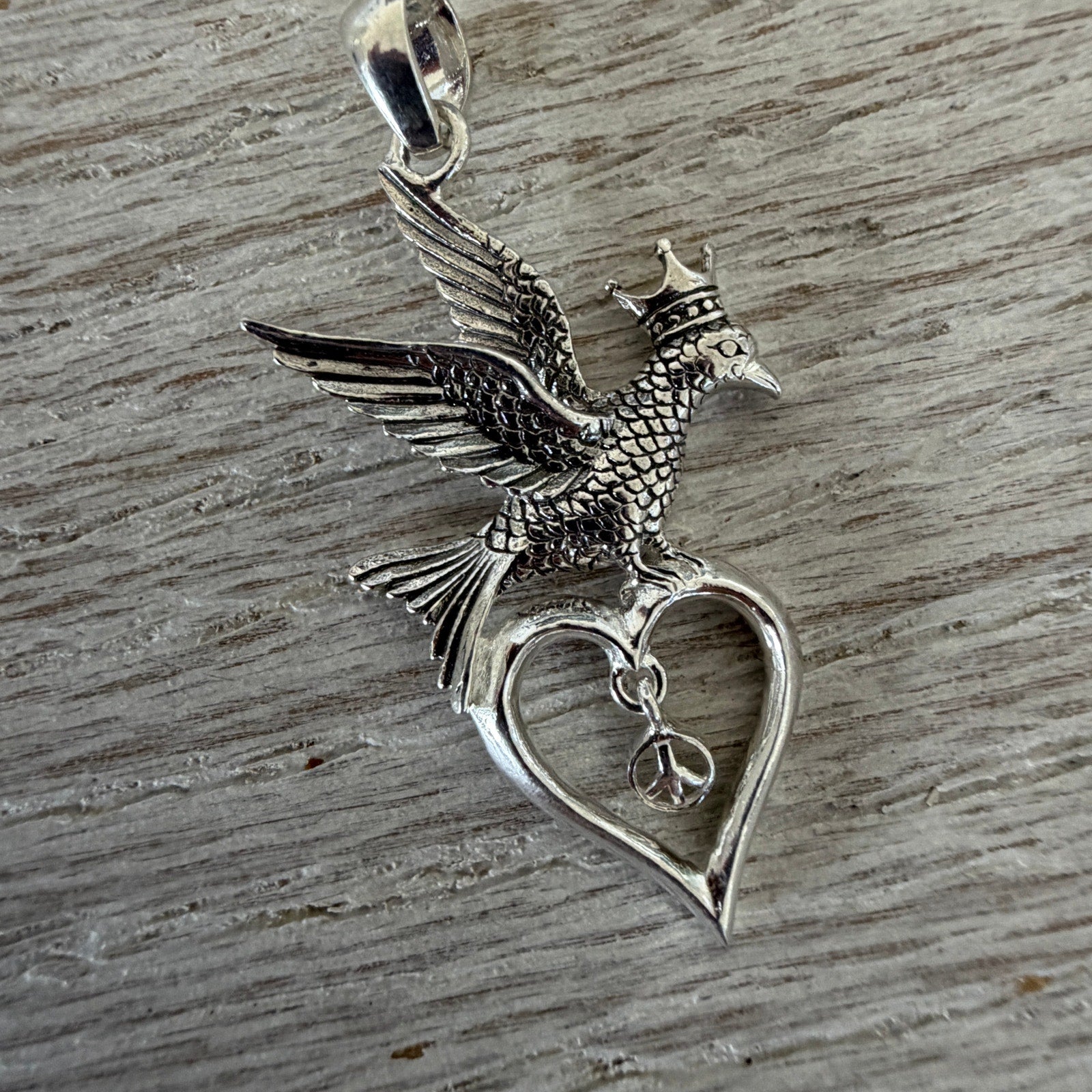This detailed pendant features a crowned dove in flight above a heart-shaped frame, holding a delicate peace symbol. The sculpted wings and crown add depth and movement, making this a meaningful piece that can be worn every day or gifted with intention.