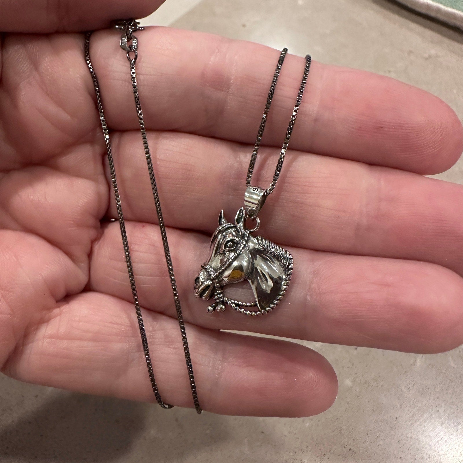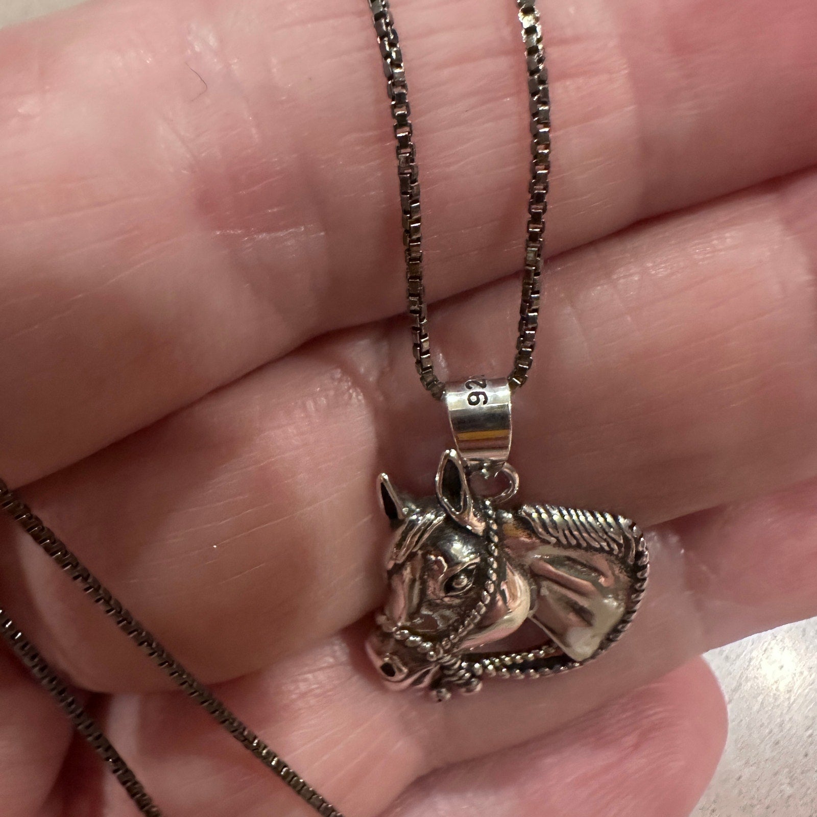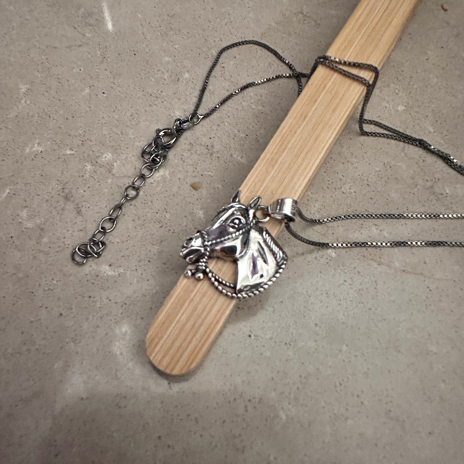Celebrate your love for horses with this striking sterling silver horse head pendant, featuring intricate detailing and a bold presence. Paired with a sleek black rhodium-plated chain, this necklace is perfect for equestrians, western style lovers, or anyone who appreciates unique, animal-inspired jewelry. A powerful and graceful piece for any collection.