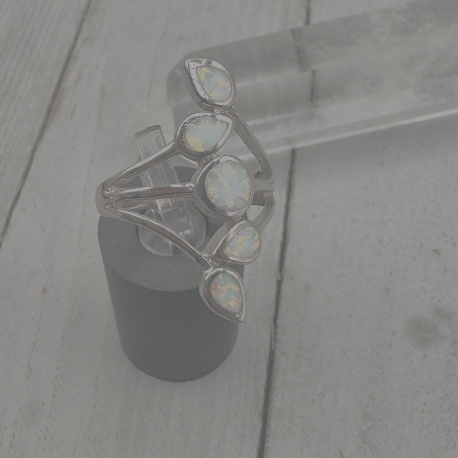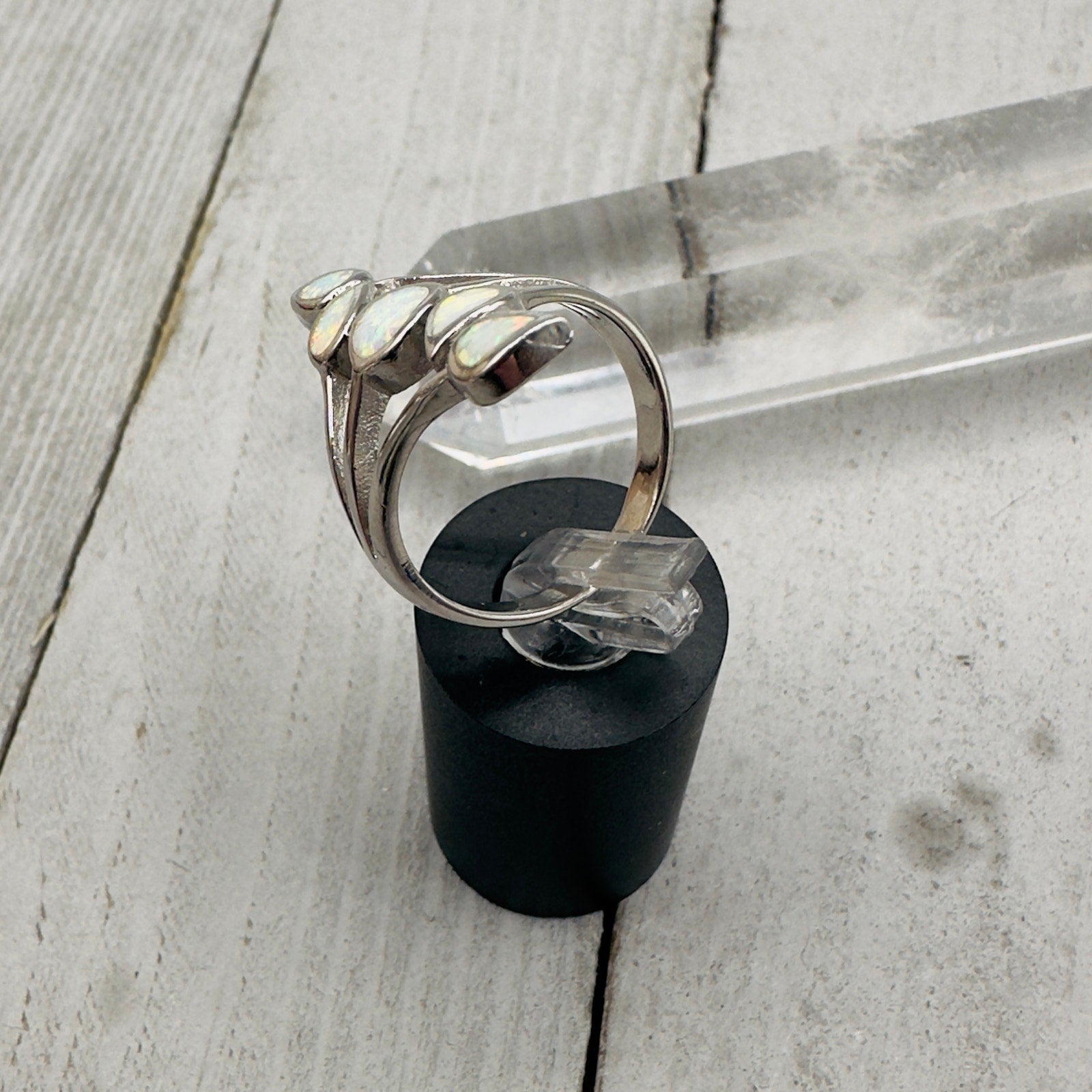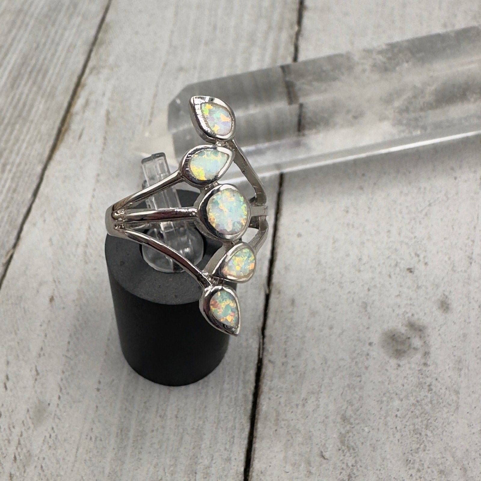 This beautiful ring features a white lab opal set in sterling silver. The opal has a mesmerizing play of color, and the sterling silver band is polished to a high shine. This ring would make a wonderful addition to any jewelry collection!