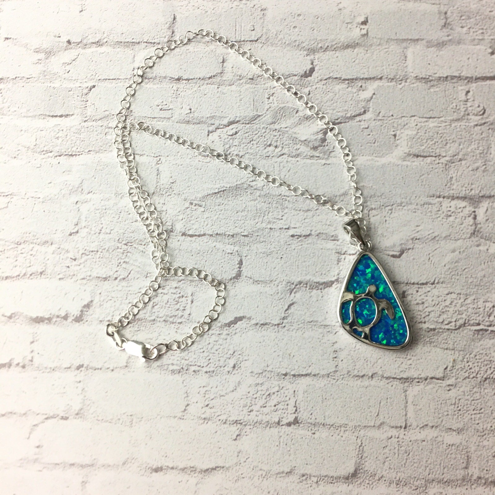 Sterling silver turtle pendant with vibrant lab-created blue opal inlay. Pendant is stamped 925 and rhodium-covered for added shine and durability. Comes on a 16-inch sterling silver rolo chain with a lobster clasp. Beautiful ocean-inspired design with bright, shimmering color.