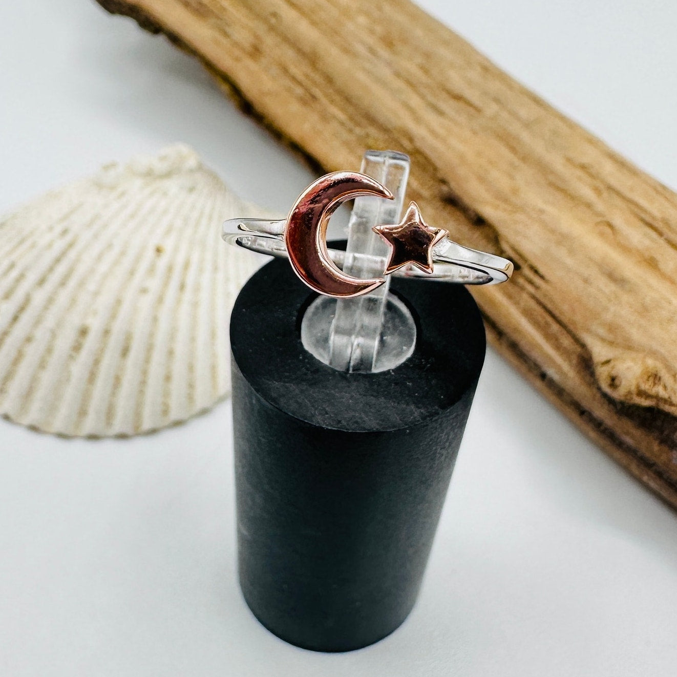 Sterling Silver Moon & Star Ring – Rose Gold & Rhodium Plated