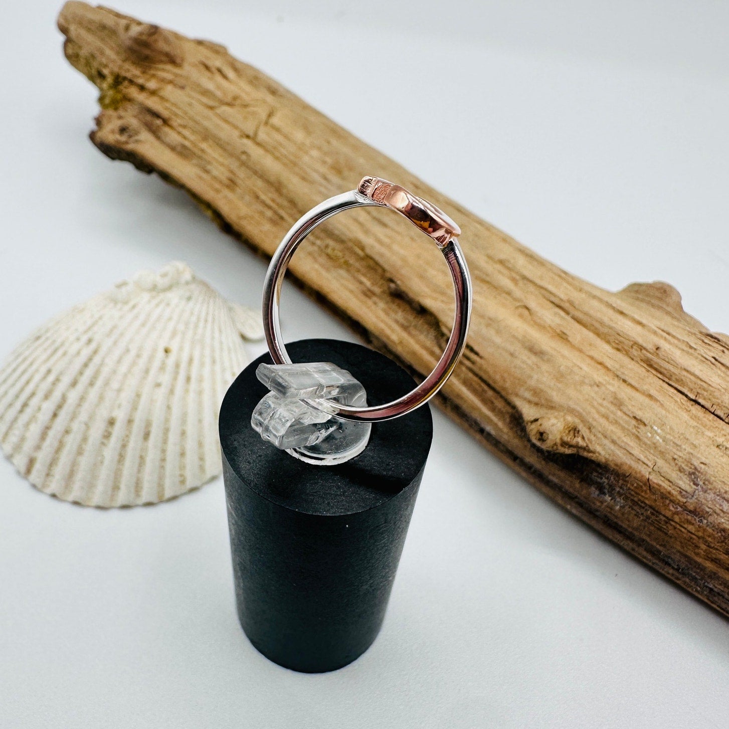 A dainty celestial-inspired ring featuring a shimmering crescent moon and star design. Crafted from genuine sterling silver, the moon is plated in warm rose gold while the band is finished with rhodium for lasting shine. Available in multiple sizes, this delicate piece is perfect for everyday wear or as a thoughtful gift.