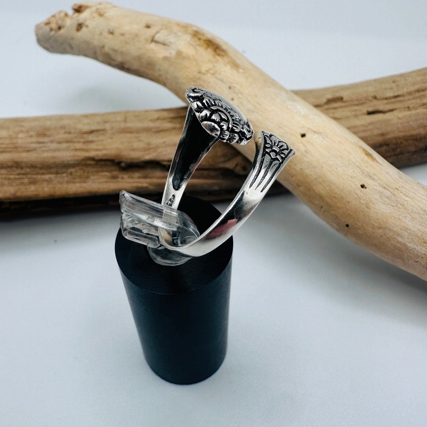 Unique sterling silver spoon ring featuring a vintage-inspired floral pattern and a comfortable wrap-around design.