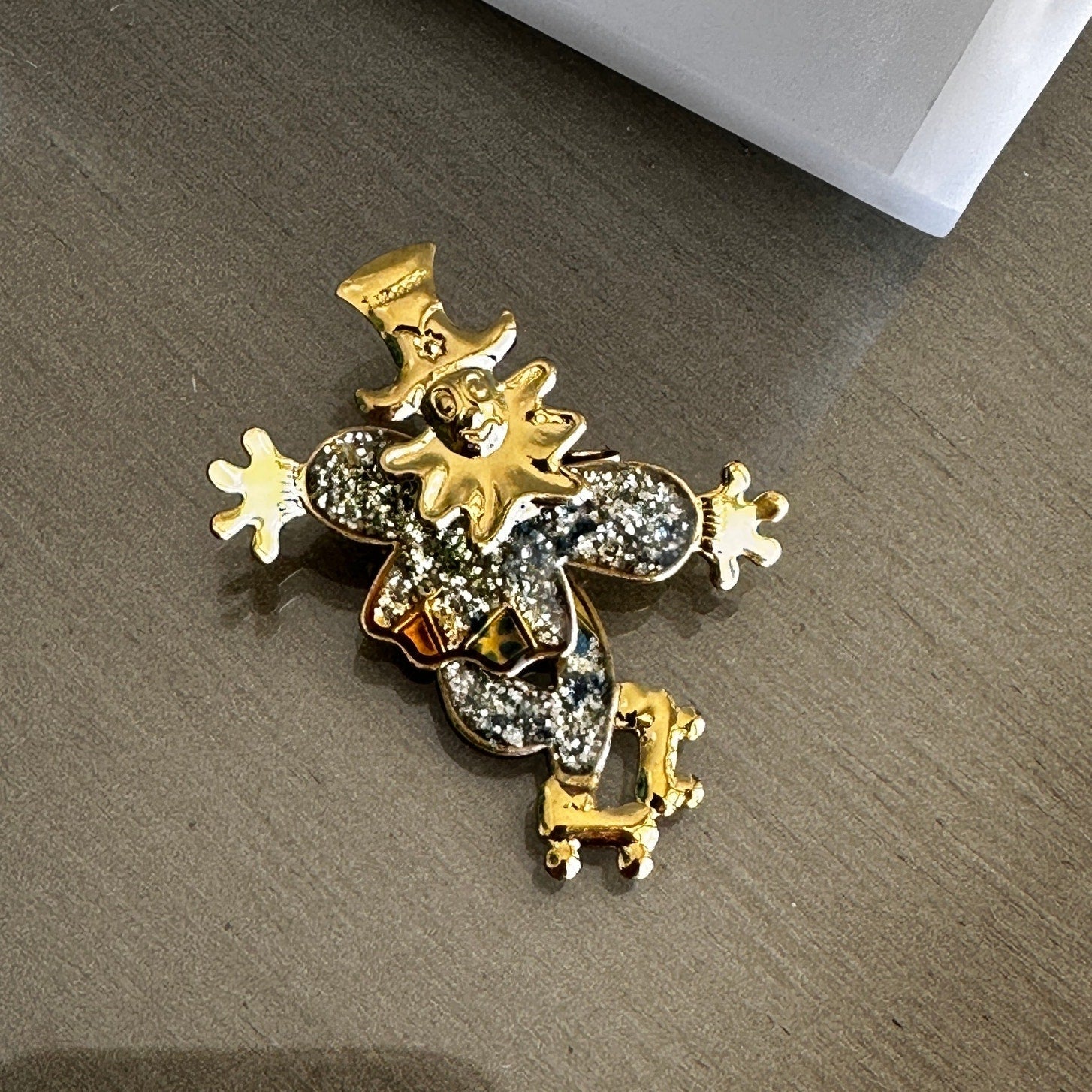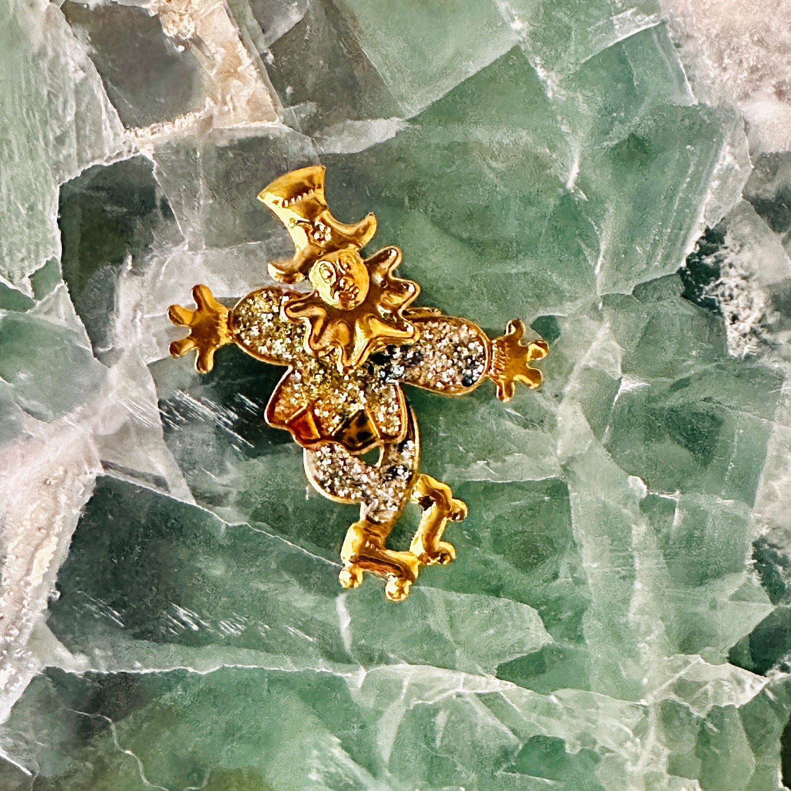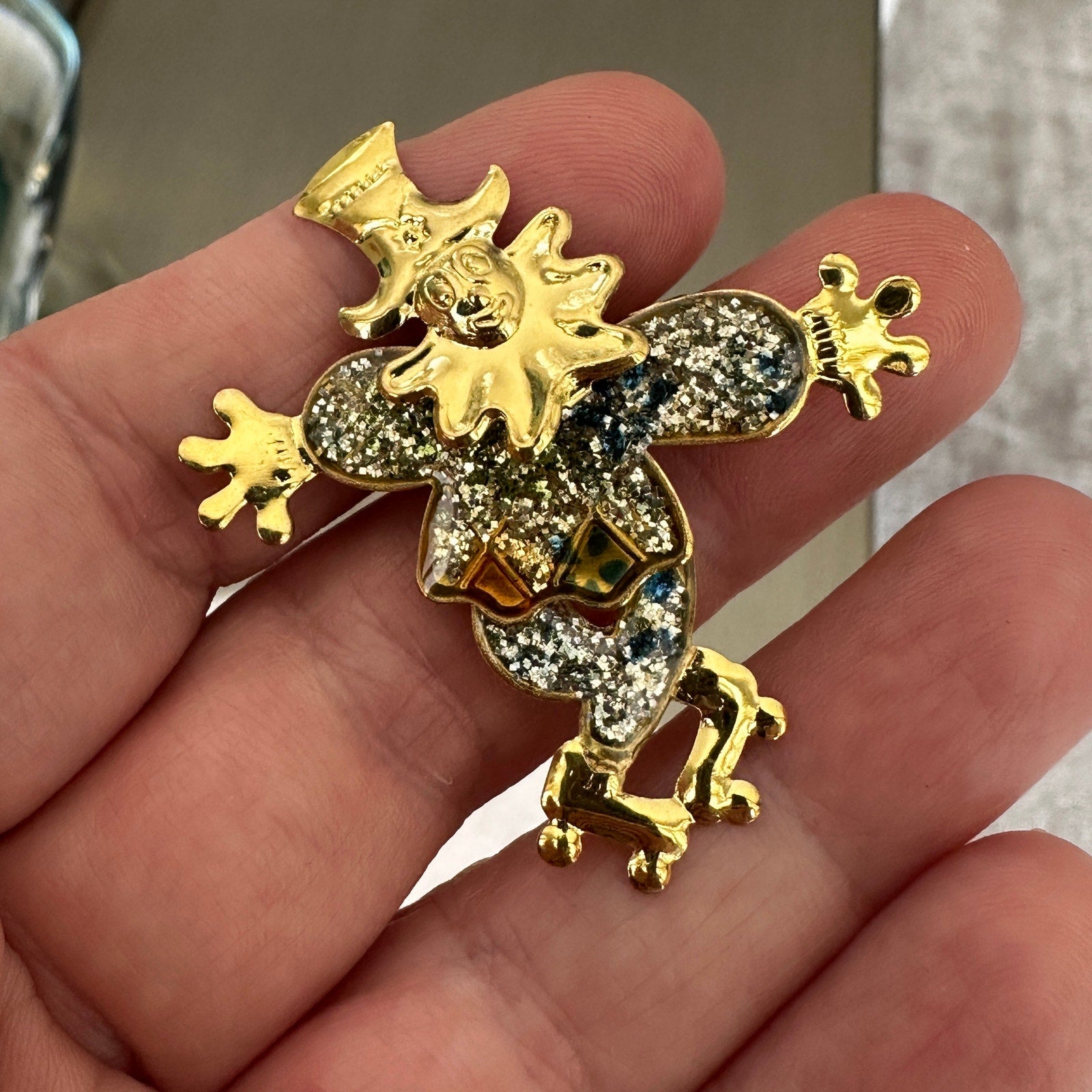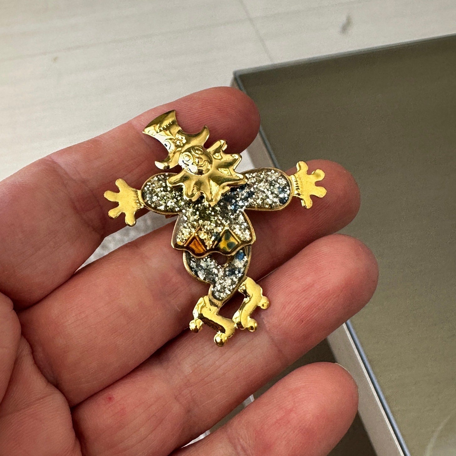 Charming vintage Harlequin clown brooch with moveable arms and legs. Features a whimsical design with a semi-transparent glitter enamel finish for a playful sparkle. Gold-tone metal adds a touch of classic vintage flair.