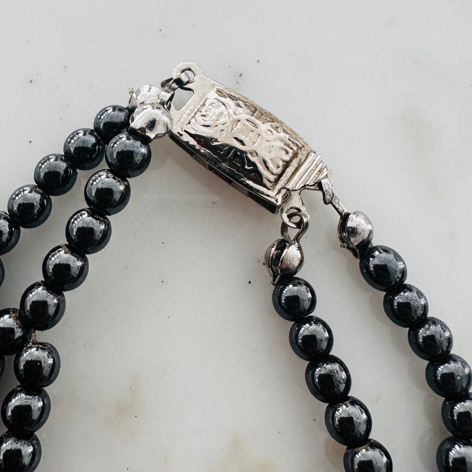 Striking vintage necklace featuring three strands of polished hematite beads with light green spacer accents. The reflective, metallic finish of hematite gives it a bold, edgy vibe—perfect for dressing up or down. Finished with a secure clasp and layered design that makes a beautiful statement.