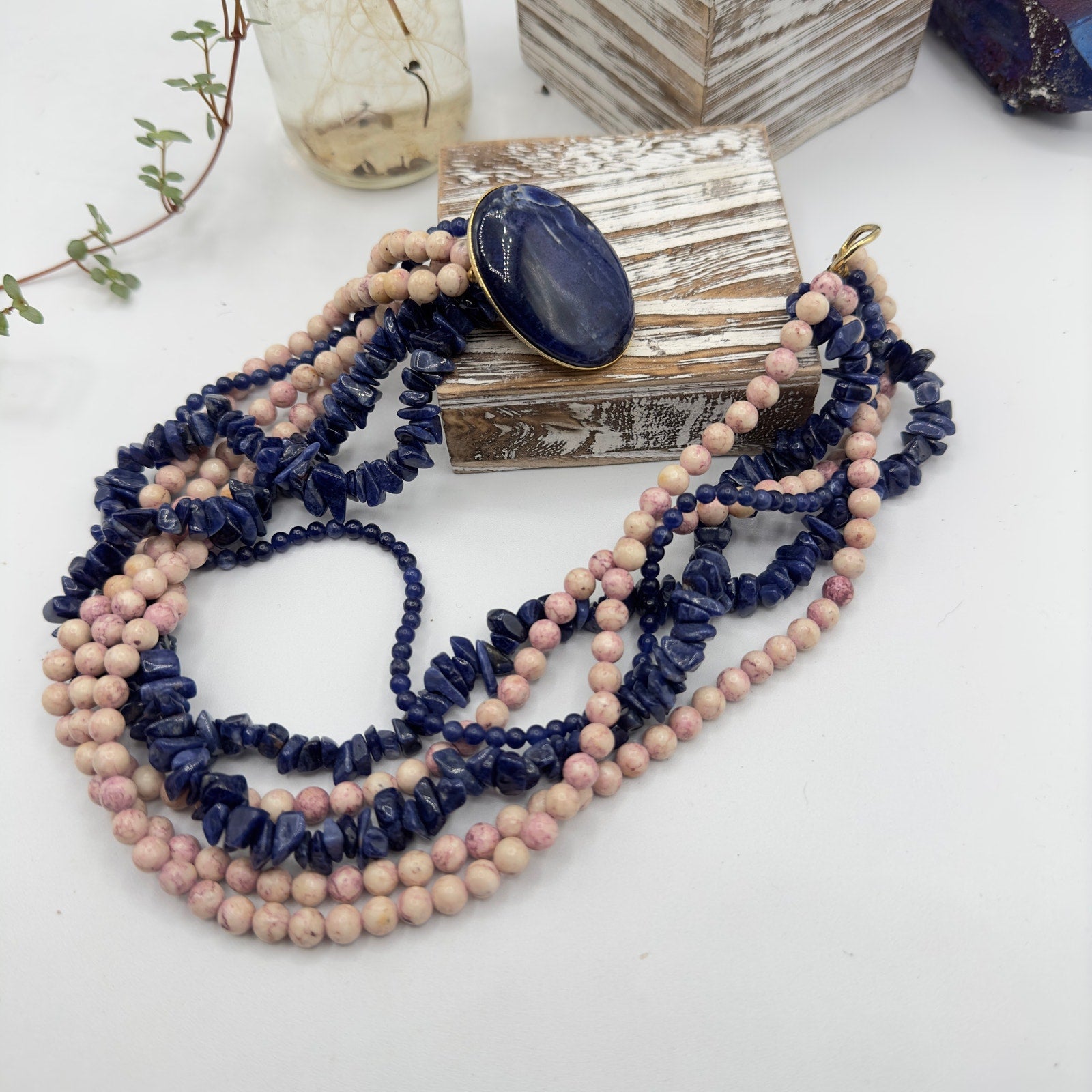 Vintage Lapis Lazuli & Jasper Multi-Strand Gemstone Necklace-Statement Boho Jewelry