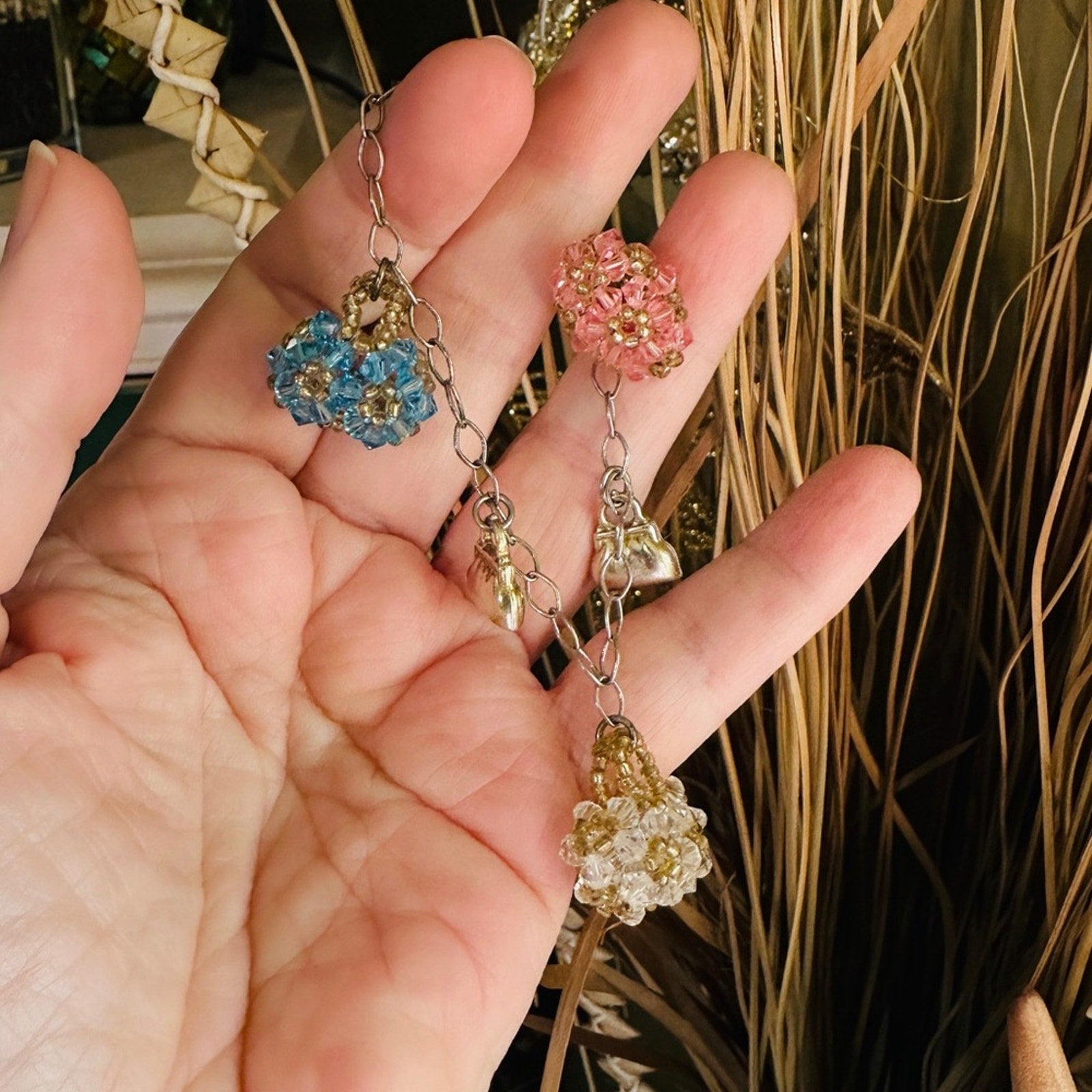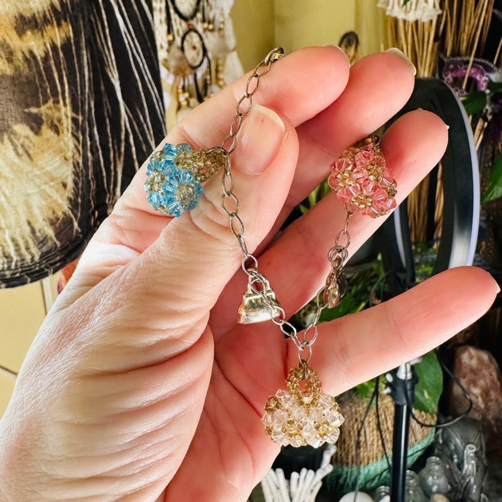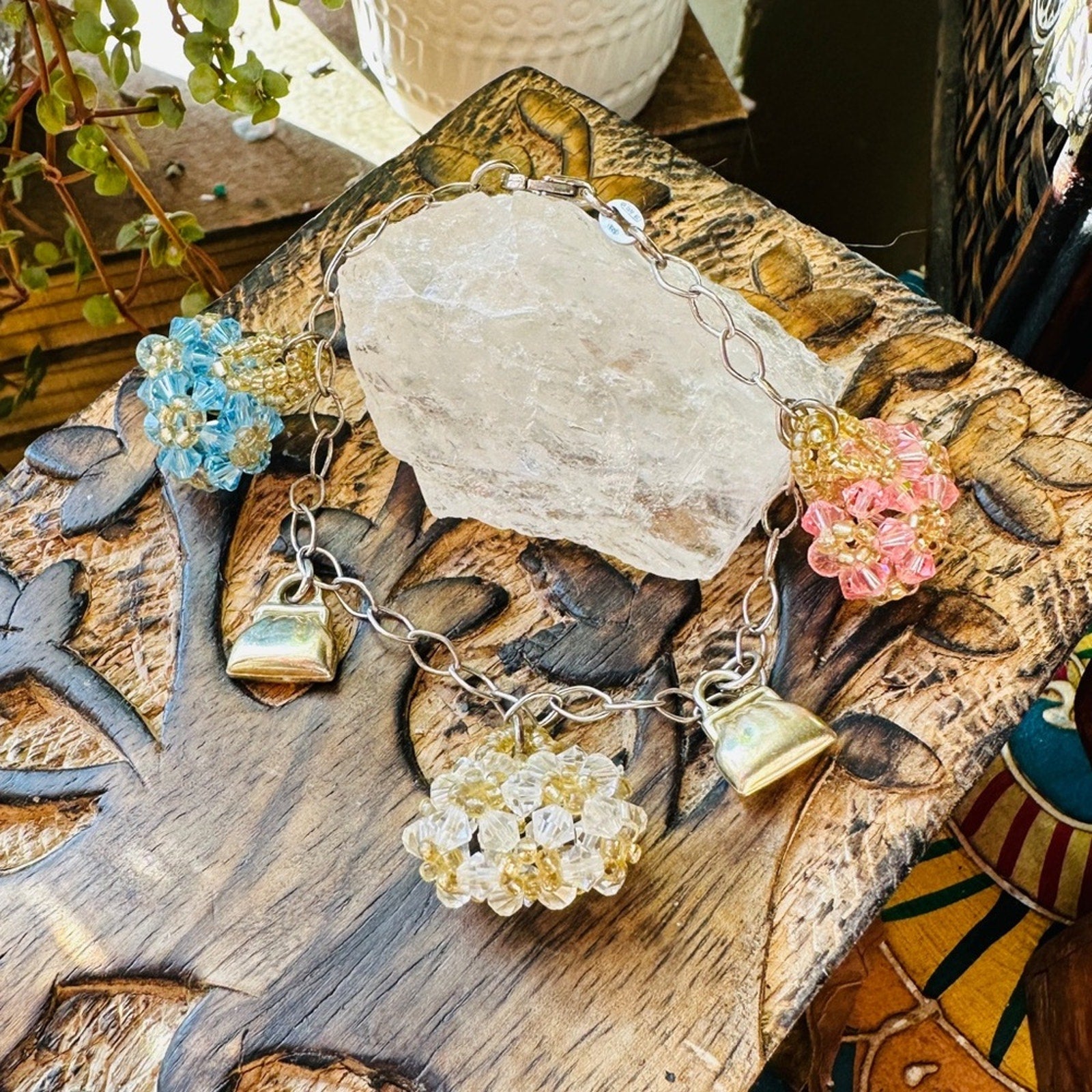 Such a unique and beautifully detailed vintage sterling silver charm bracelet featuring five mini purse charms. Three purses are crafted from sparkling bicone crystals and seed beads, and two are solid sterling silver handbags. A playful yet elegant statement piece for any charm lover.